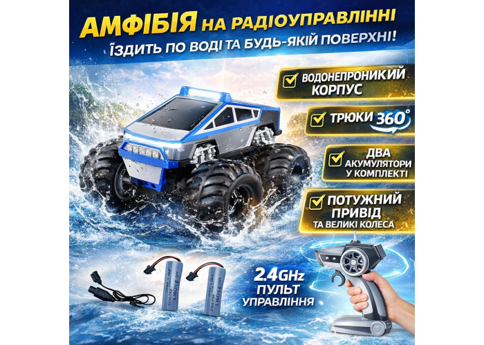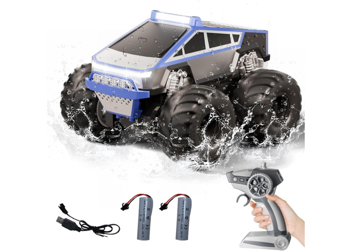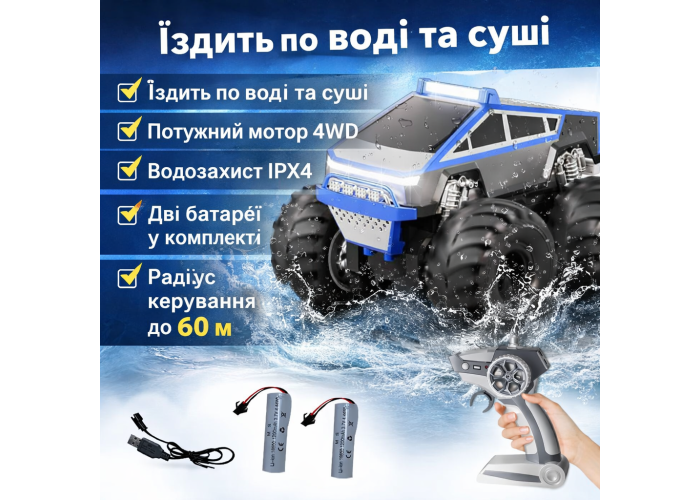 Радіокерована амфібія 4WD Waterproof Stunt Car — це багатофункціональна позашляхова машинка, здатна легко пересуватися водою, піском, травою, камінням, снігом та іншим типам поверхні. Повністю водонепроникний корпус дає змогу пристрою працювати навіть за повного занурення у воду, а потужний привод забезпечує високу динаміку та стійкість у будь-яких умовах.