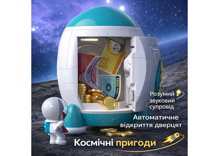 Він імітує справжній сейф, має дисковий номеронабірник і відкривається за допомогою ключа. Відчиняння дверцят супроводжується характерними звуками, створюючи відчуття роботи справжнього сейфа. Скарбничка також обладнана світловими ефектами та музичним супроводом, що робить процес накопичення не тільки корисним, але й захопливим для дітей.