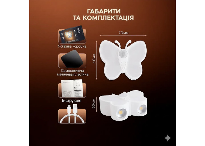 Світлодіодний нічник "Метелик" являє собою сучасне та стильне рішення для створення м'якого та функціонального освітлення в житлових приміщеннях. Він поєднує в собі естетичний дизайн, що схожий на метелика, і високу енергоефективність, працюючи повністю автономно від вбудованого акумулятора. Ідеальний для використання в місцях, де потрібне короткочасне освітлення: коридори, сходи, гардеробні, ванні кімнати або підвали.