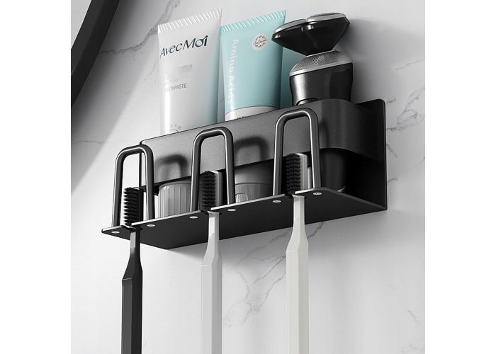 Тримач виготовлений як алюмінева панель, на якій розташовані отвори для зубних щіток і додаткових аксесуарів. Цей тримач для зубних щіток ідеально підходить для зберігання не тільки зубних щіток, а й інших предметів гігієни, як-от зубна паста, шампунь, гель для душу тощо. Він має кілька відділень різного розміру, що дає змогу зручно розташувати всі необхідні предмети. Тримач для зубних щіток — це не тільки практичний, але і стильний аксесуар для ванної кімнати.