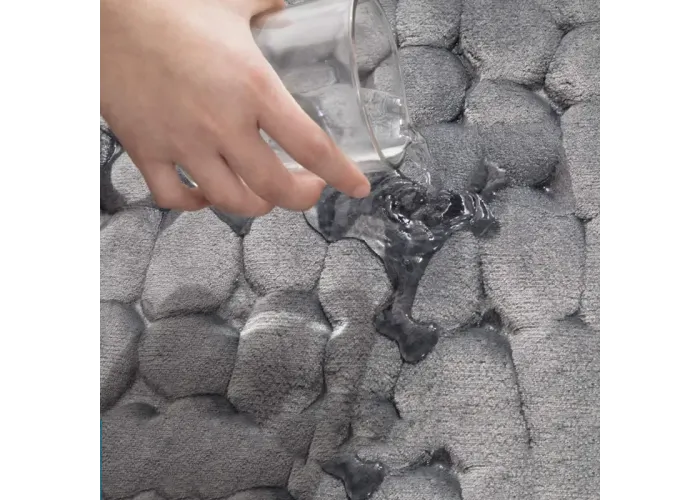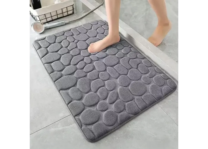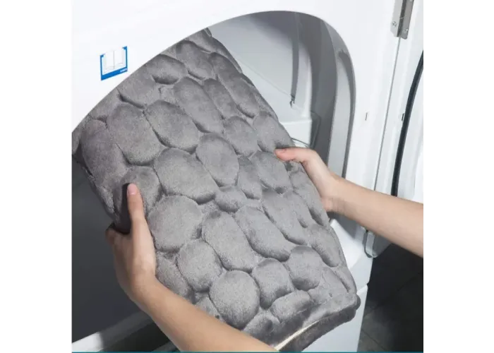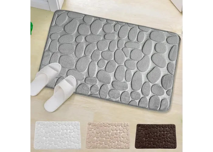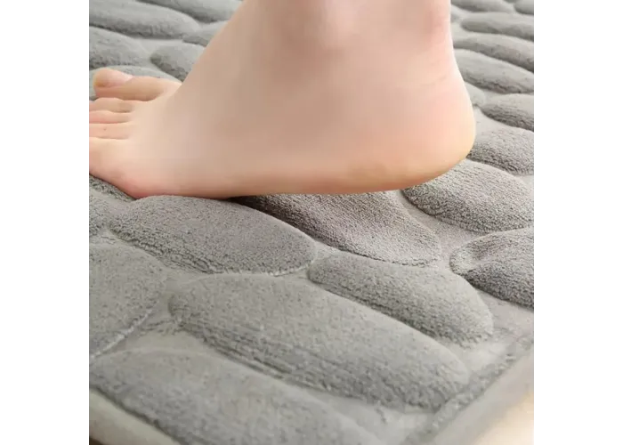 Стильний, м'який, коротко-ворсовий, об'ємний відбиток камінців. Має протиковзне покриття, чудово поглинає вологу, легкий у використанні, швидко та просто переться і сохне. Антиковзне покриття зробить щоденне використання всіма членами сім'ї максимально безпечним.