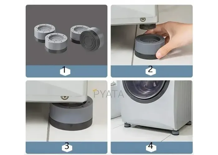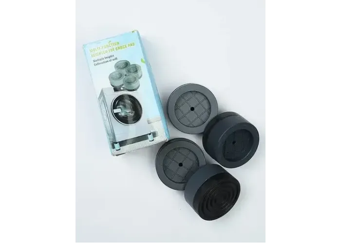Антивібраційні підставки поглинають вібрації пральної або сушильної машини, даючи змогу техніці стійко стояти на підлозі. Це універсальні силіконові амортизувальні підставки для пральних машин. Ці подушки для ніжок пральної машини потрібні для того, щоб знизити її вібрацію під час процесу прання. Також, крім зниження коливання машинки, підставки виконують ще й інші функції. Вони не дають ковзати пральній машинці підлогою, не дають їй стрибати, а також знижують рівень шуму. У такий спосіб захищають підлогу від подряпин.