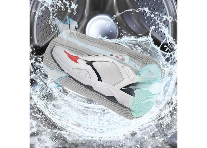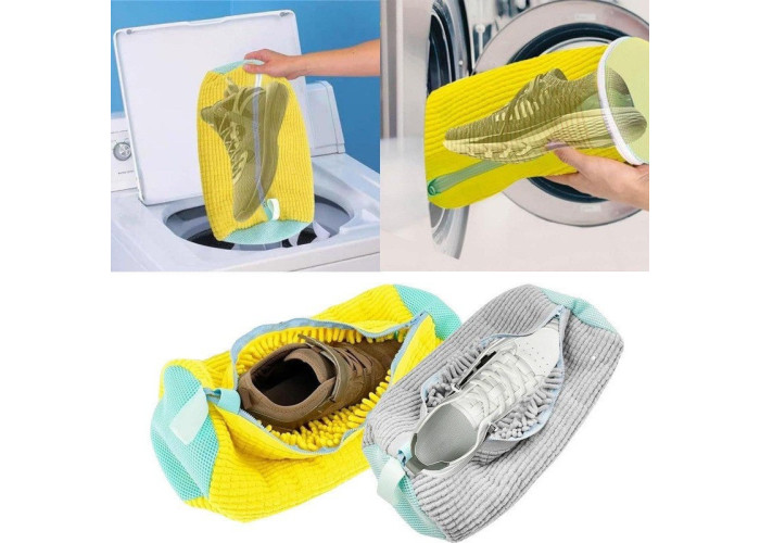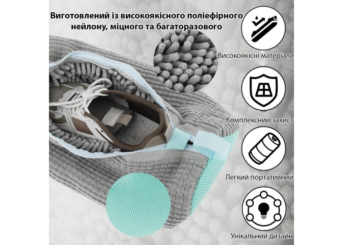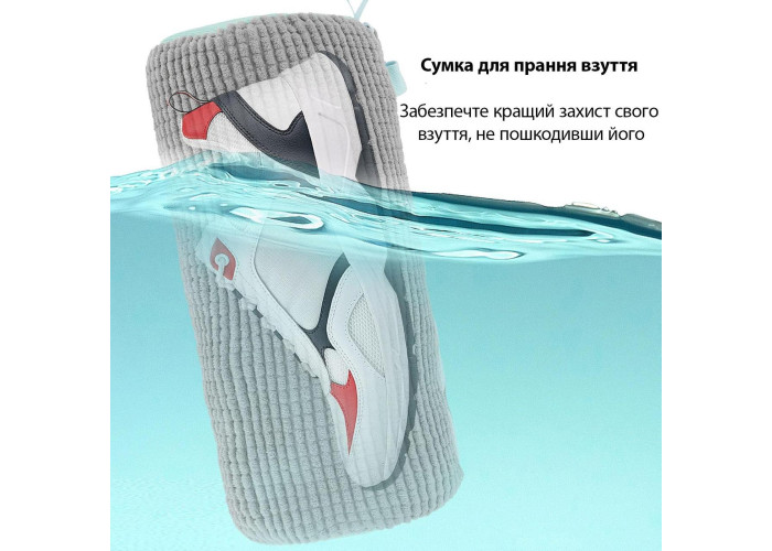 Мішок виготовлений зі спеціальної сітки для прання білизни, яка ніжно очищає взуття, не пошкоджуючи його поверхню. Мішок забезпечують дбайливе прання ваших кросівок, кедів та іншого взуття. М'які волокна мікрофібри всередині мішка делікатно видаляють забруднення.