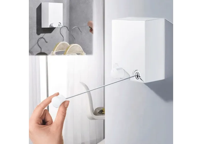 Висувна мотузка для білизни стане чудовим вибором для тих, хто хоче заощадити вільний простір у кімнаті. Маленькі розміри та зручне кріплення дають змогу розмістити сушарку де завгодно, а автоматичне змотування троса дасть змогу прибрати мотузку на один бік.