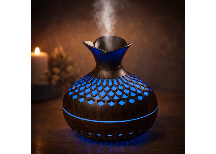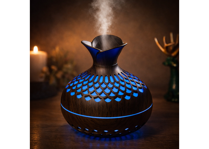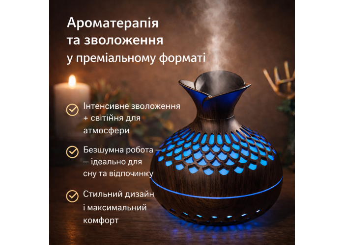 Вбудована 7-колірна LED-підсвітка створює розслаблювальну атмосферу та може використовуватися як декоративний нічник. Технологія ультразвукового розпилення забезпечує тиху роботу, що робить прилад ідеальним для нічного використання. Функція автоматичного вимкнення, якщо немає води гарантує безпеку та продовжує термін експлуатації пристрою.