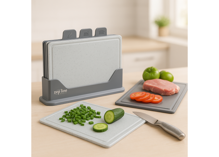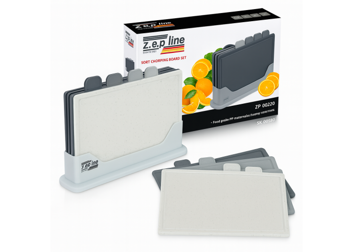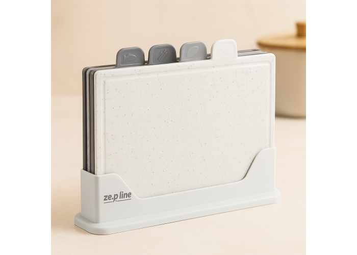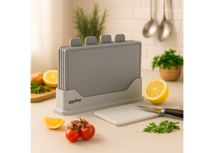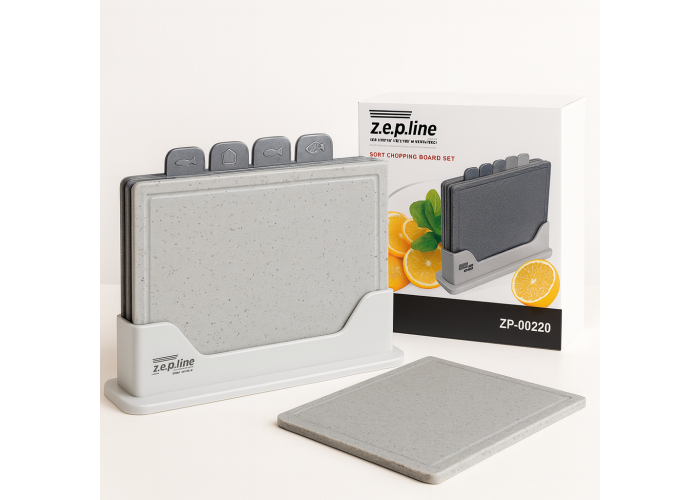 Набір обробних дощок Zepline ZP-00220 Grey Modern — це сучасне рішення для кухні, де важливі стиль, чистота та зручність. До комплекту входить 5 предметів: чотири функціональні дошки для різних продуктів (м'ясо, риба, овочі, хліб) і підставка для компактного зберігання.