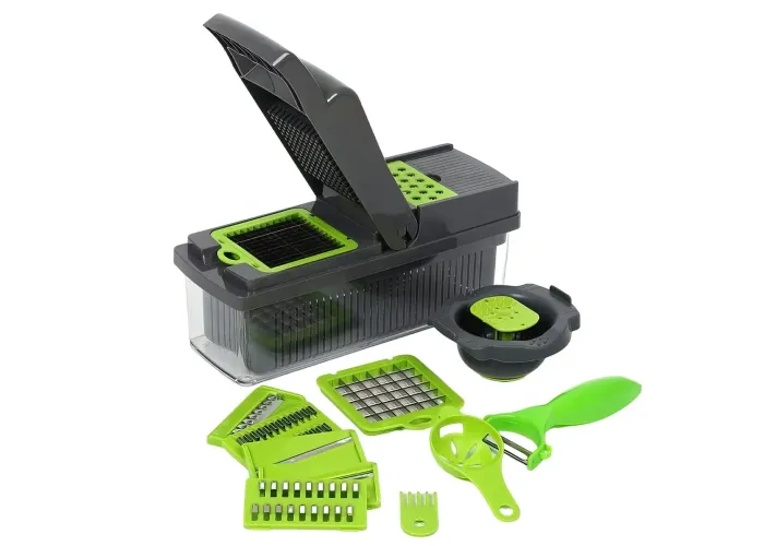 Має регульовану мандоліну, що дає змогу налаштовувати розмір і форму нарізування. Всі леза зберігаються в контейнері, що гарантує безпеку використання і зберігання. Чудовий вибір як для повсякденного використання на кухні, так і для виїздів на природу.