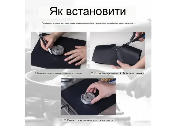 якщо внутрішні отвори в накладках малі та пелюстки з просічками, якими або в такий спосіб стикаються з конфоркою або потрапляють у зону відкритого вогню, що виходить із конфорки, акуратно обріжте пелюстки по колу ножицями, розширивши посадковий отвір до необхідного розміру.