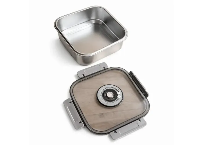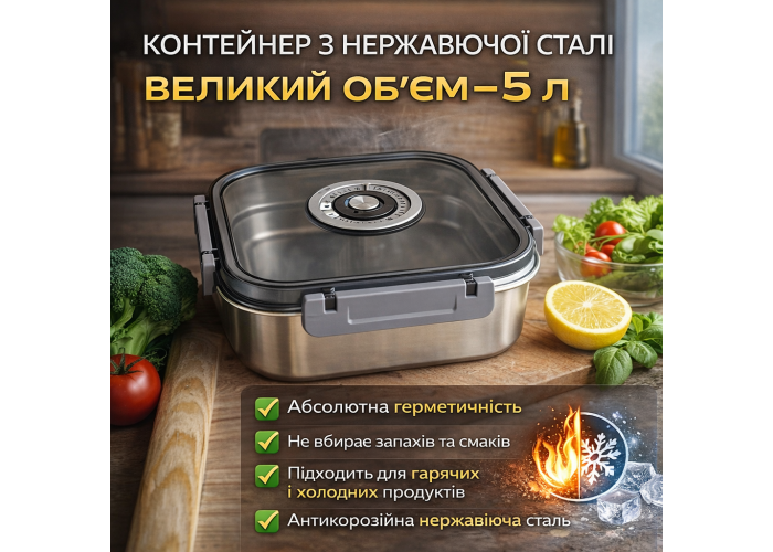 Харчовий контейнер із неіржавкої сталі об'ємом 5000 ml — це практичне та надійне рішення для зберігання продуктів удома або на кухні професійного рівня. Міцний корпус із неіржавкої сталі не вбирає запахи та смаки, стійкий до корозії й безпечний для будь-яких продуктів. Зручна кришка щільно закривається, зберігаючи свіжість вмісту та захищаючи його від зовнішніх впливів. Квадратна форма дає змогу раціонально використовувати простір у холодильнику або шафі, а стильний сірий колір робить контейнер акуратним і сучасним доповненням до кухонного інтер'єру. Чудово підходить для зберігання готових страв, заготівок та інгредієнтів у великому обсязі.