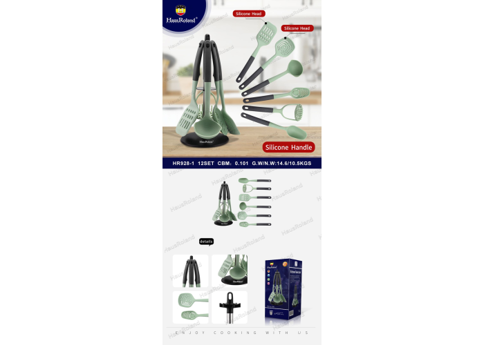 Набір Haus Roland HR928-1 створений для сучасної кулінарії, де важливі і функціональність, і стиль. Кожен інструмент має міцний нейлоновий стрижень, повністю покритий харчовим термостійким силіконом. Така конструкція забезпечує довговічність та гнучкість, а головне — абсолютну безпеку для всіх типів посуду, включаючи найделікатніші антипригарні покриття. Цільне силіконове покриття ручок та робочих частин робить аксесуари гігієнічними та легкими у догляді. Всі 6 інструментів компактно розміщуються на обертовій підставці-каруселі для максимальної зручності. Переваги Повністю із силікону: Гігієнічно, легко миється і не вбирає запахи. Безпечно для посуду: Не залишає подряпин на антипригарних та керамічних покриттях. Висока термостійкість: Ідеально підходить для використання за високих температур. Міцна основа: Нейлоновий стрижень всередині забезпечує жорсткість та довговічність. Зручність на 360°: Обертова підставка для легкого доступу до всіх предметів. Сучасний дизайн: Мінімалістичний вигляд та приємний колір прикрасять будь-яку кухню. Технічні характеристики Модель: HR928-1 Матеріал: Нейлон (внутрішній стрижень), Харчовий силікон (зовнішнє покриття) Матеріал ручок: Силікон Підставка: Обертова (карусель) Кількість предметів: 7 (6 інструментів + 1 підставка) Комплектація Лопатка з прорізами Ополоник Шумівка Ложка з прорізами Ложка кухарська Товкачка для картоплі Обертова підставка