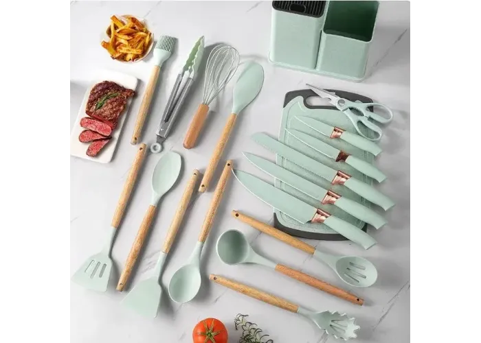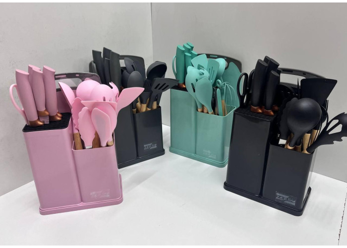 Набір силіконових кухарів і ножів із неіржавки на підставці.
