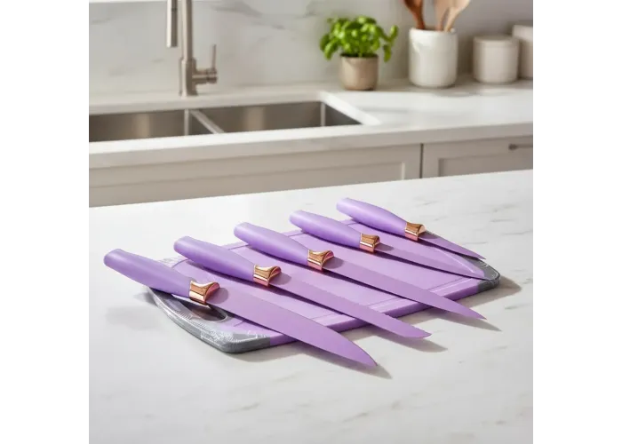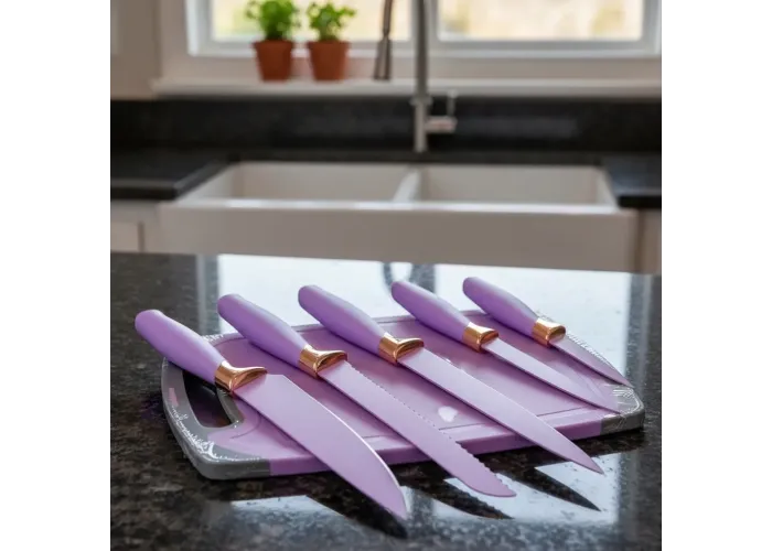 Зручність і функціональність: З набором постачається стильна підставка та простора обробна дошка, які допоможуть вам організувати робочий простір і зберегти лад на кухні. Асортимент ножів містить кухарські, універсальні та хлібні ножі різних розмірів, що дасть змогу вам легко справлятися з різними типами продуктів.