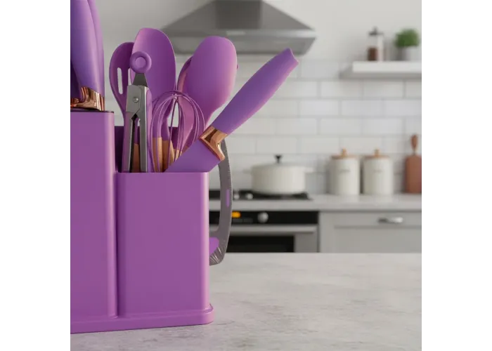 Кожен інструмент — ключ до досконалості: Від ножів для нарізування до кулінарних лопаток, цей набір містить усе необхідне для приготування, перемішування, нарізання та сервірування страв. Ножиці та зручні щипці для м'яса додають додаткову гнучкість і багатофункціональність у використанні.