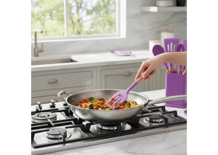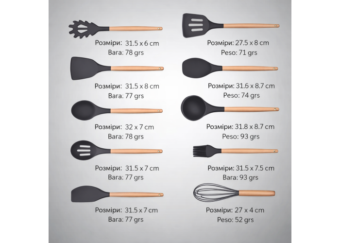 Чудові характеристики: Цей набір містить широкий спектр кухонних інструментів, створених для полегшення процесу приготування страв. Виготовлені з міцного дерева, пластику та термостійкого силікону, вони гарантують надійність, довговічність і безпеку у використанні. Кожна деталь дбайливо спроєктована, щоб поліпшити ваш досвід приготування їжі.