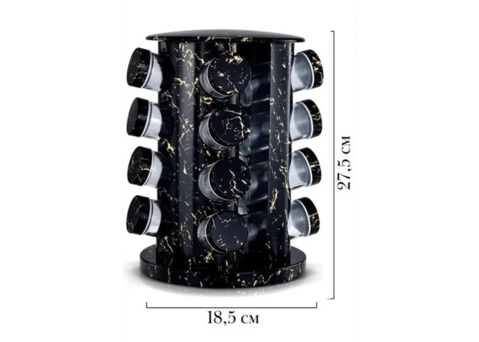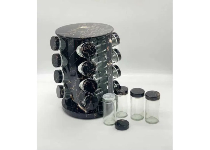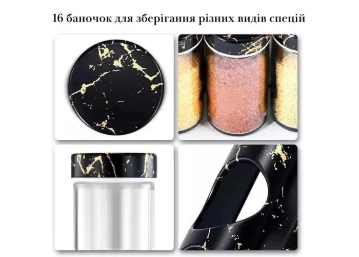 Набір для спецій на підставці обладнаний 16 окремими контейнерами, призначеними для зберігання різних спецій. Ці відсіки дають змогу зручно розмістити й організувати спеції, що спрощує процес приготування їжі. Однією з ключових переваг цієї каруселі є її здатність обертатися на 360 градусів.