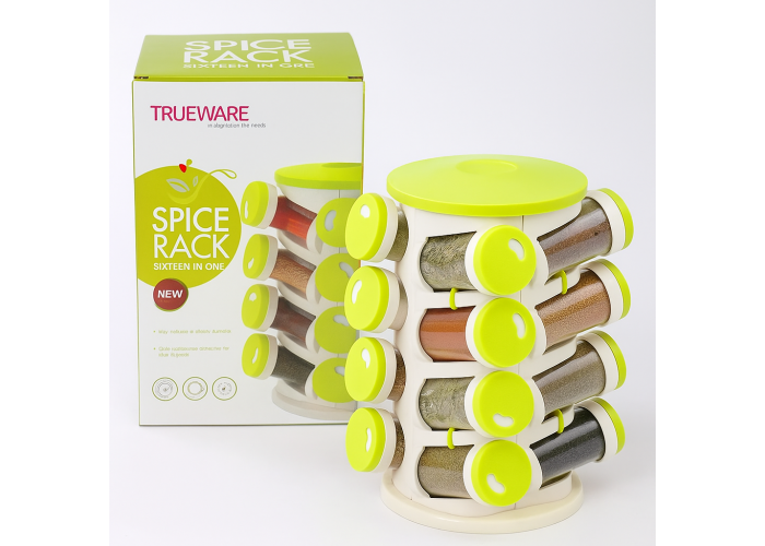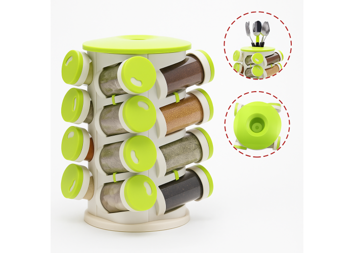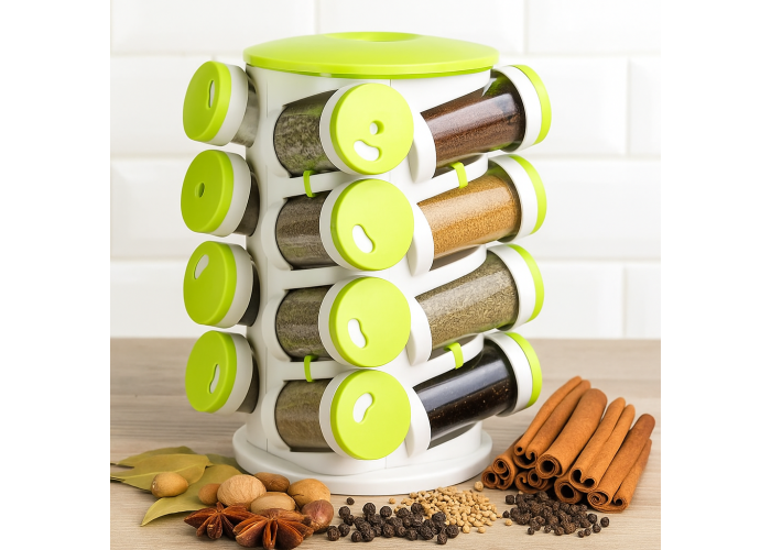 Набір містить 16 пластикових контейнерів для найрізноманітніших спецій. Усі різновиди перців, трави та інші приправи. Стійка виготовлена з харчового пластику, легко обертається. Кожен контейнер просто виймається, миється й наповнюється.