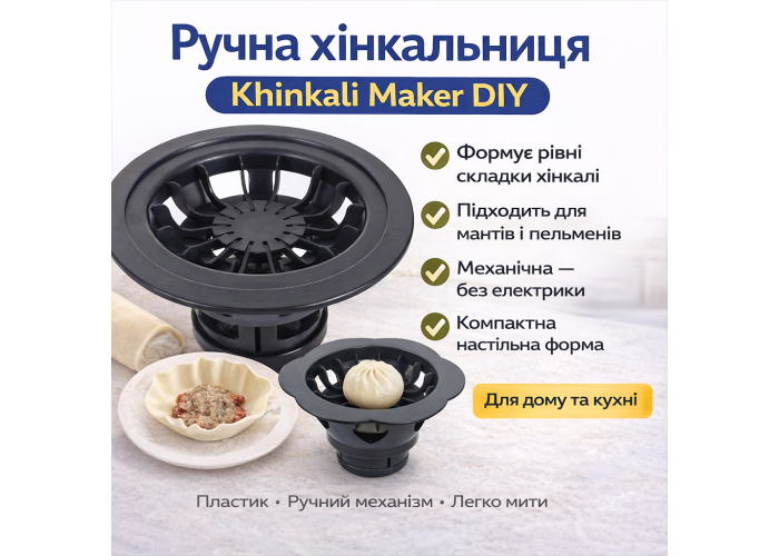 Khinkali Maker DIY — це ручна настільна хінкальниця, призначена для формування хінкалі та інших виробів із тіста. Пристрій працює за механічним принципом і дозволяє швидко та акуратно формувати вироби з рівними складками.