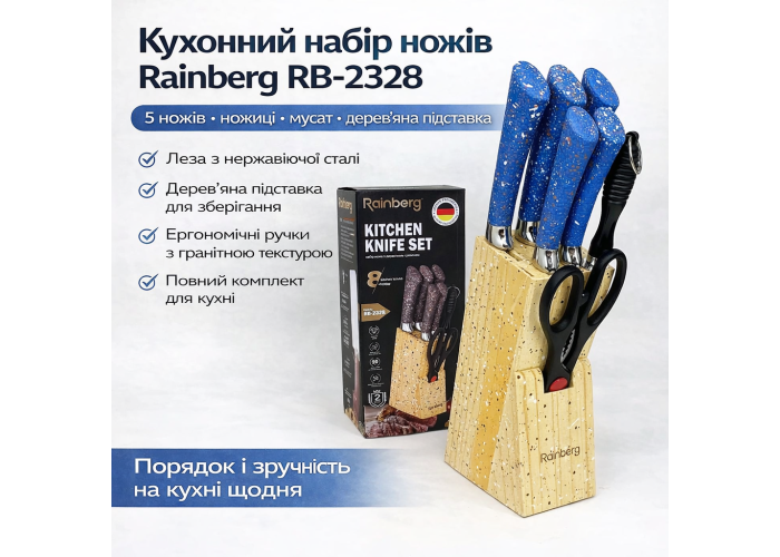 Кухонний набір ножів Rainberg RB-2328 — це функціональний комплект для щоденного використання на домашній кухні, який містить усі основні інструменти для підготовки продуктів і зручного зберігання.
