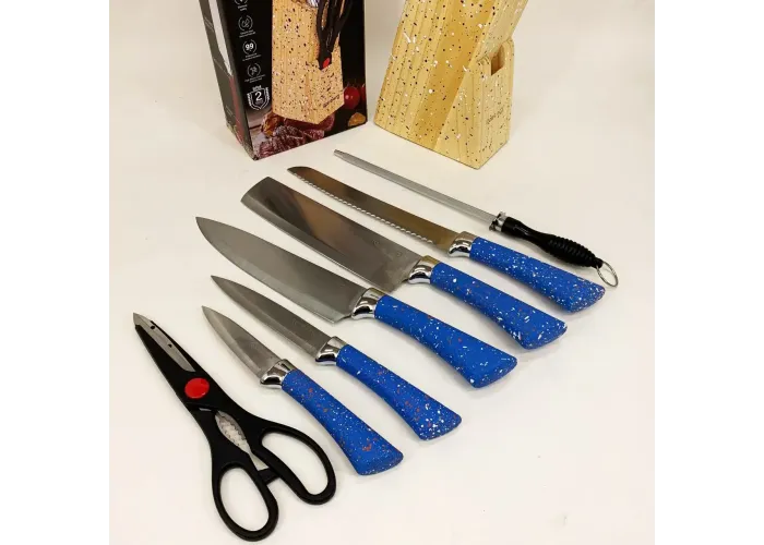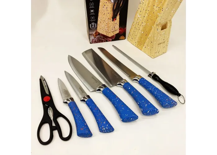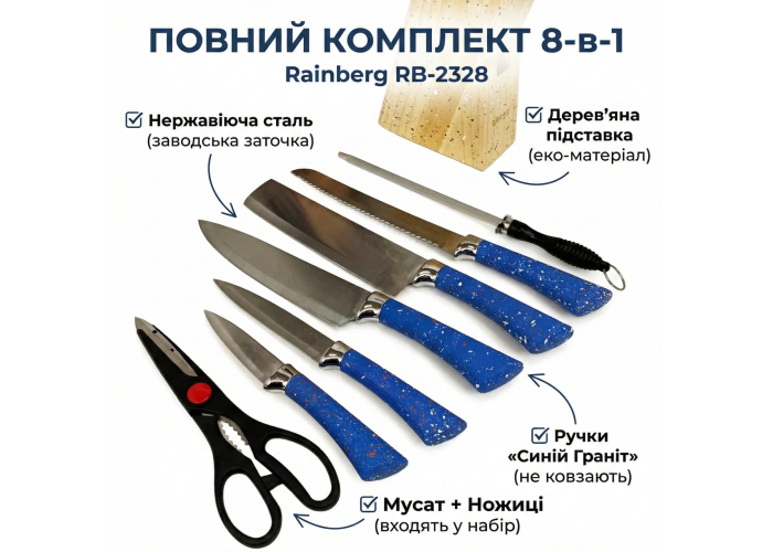 Кухонний набір ножів Rainberg RB-2328 Синій з неіржавкої сталі з дерев'яною підставкою, мусатом і ножицями, 8 предметів
