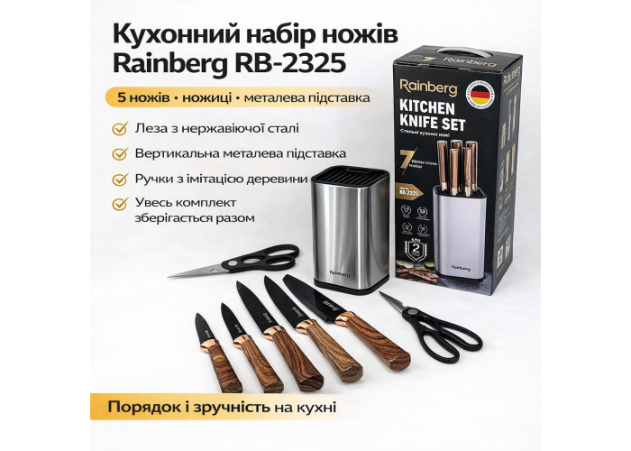 Набір кухонних ножів Rainberg RB-2325 — це повноцінний комплект для домашньої кухні, призначений для щоденного використання і закриває основні завдання під час приготування їжі.