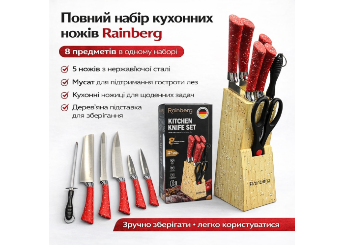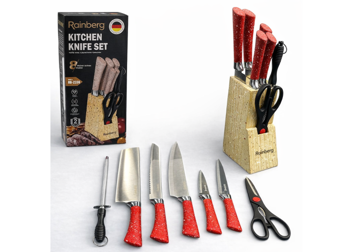 Кухонний набір ножів Rainberg RB-2328 — це функціональний комплект для щоденного використання на домашній кухні, який містить усі основні інструменти для підготовки продуктів і зручного зберігання.