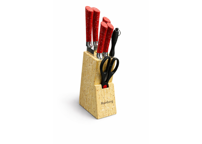 Набір кухонних ножів Rainberg RB-2328 Червоний з дерев'яною підставкою, мусатом і ножицями, 5 ножів, неіржавка сталь