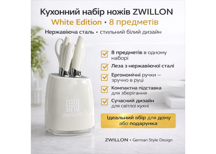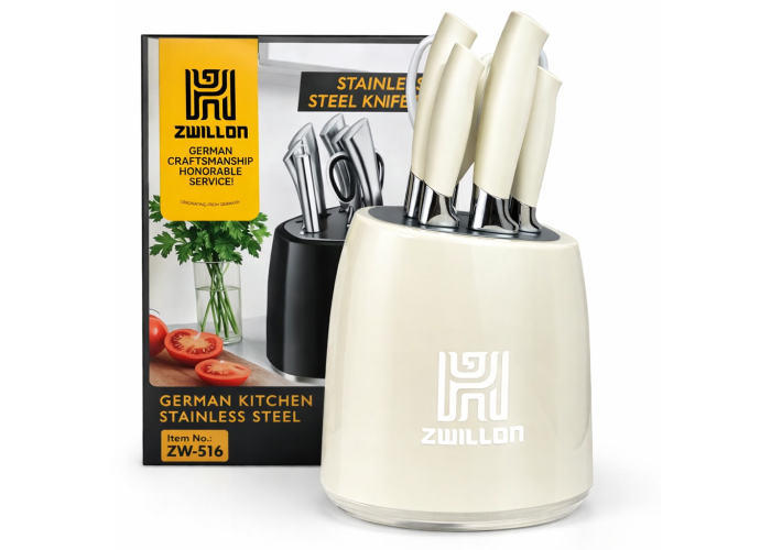 Набір кухонних ножів ZWILLON ZW-516 White Edition — це стильне та функціональне рішення для сучасної кухні в світлих інтер'єрах. Білий корпус підставки підкреслює акуратність, чистоту та мінімалізм, а професійні ножі забезпечують точну та комфортну роботу з будь-якими продуктами.