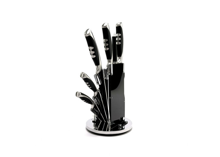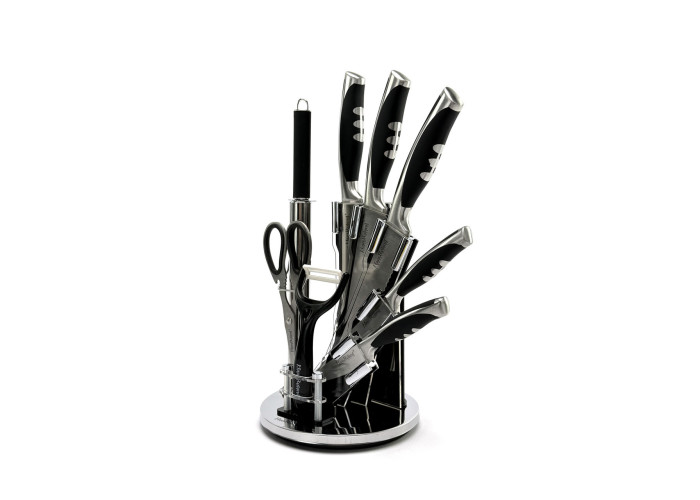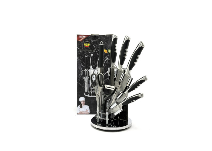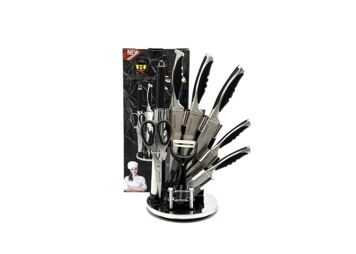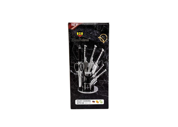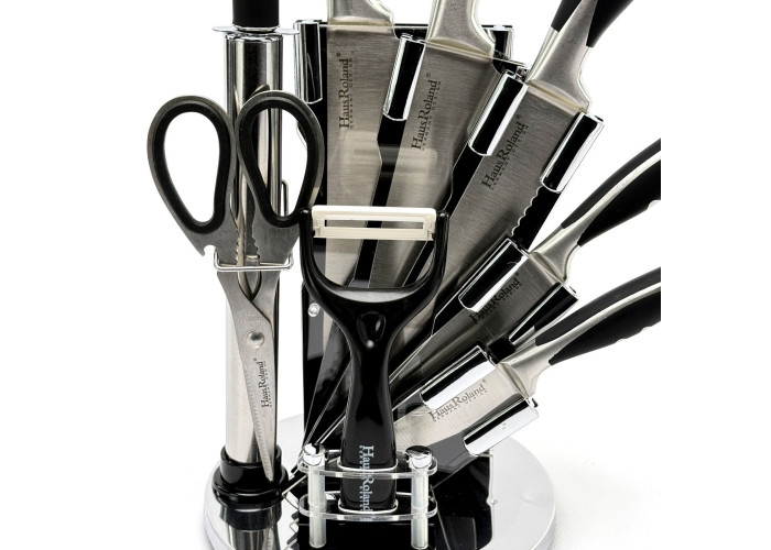 Набор Haus Roland HR610-2 створений для тих, хто не визнає компромісів на кухні. Леза з високовуглецевої сталі 3Cr13 із сатинованим поліруванням вирізняються міцністю й довго зберігають гостроту. Порожнисті ручки з неіржавкої сталі 430 роблять ножі легкими та прекрасно збалансованими. Крім п'яти ключових ножів, включно з потужною кухонною сокирою, до набору входять мусат для підтримання ідеального заточування, універсальні ножиці й овочечистка з гострим керамічним лезом. Всі інструменти ефектно розташовані на акриловій підставці, яка дає змогу легко взяти потрібний предмет і демонструє сучасний підхід до організації кухонного простору.