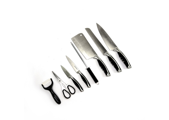 Максимальна комплектація: Містить 5 ножів, сокирку, мусат, ножиці та овочечистку.