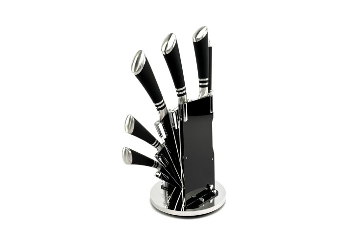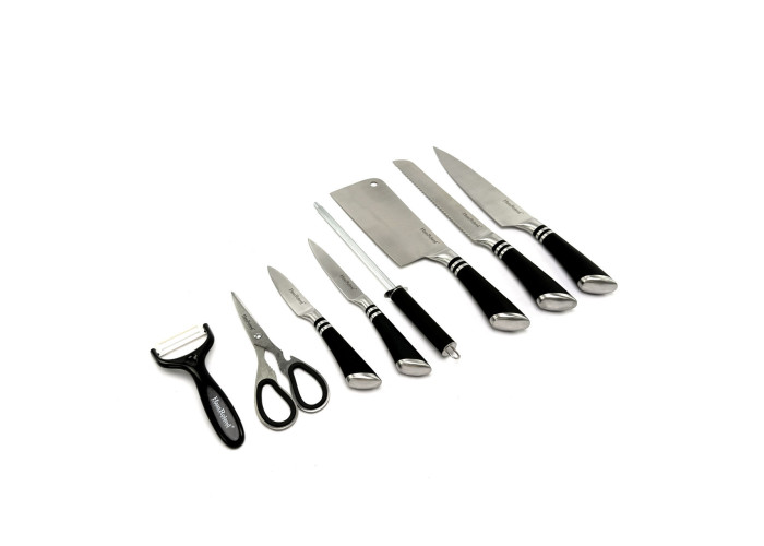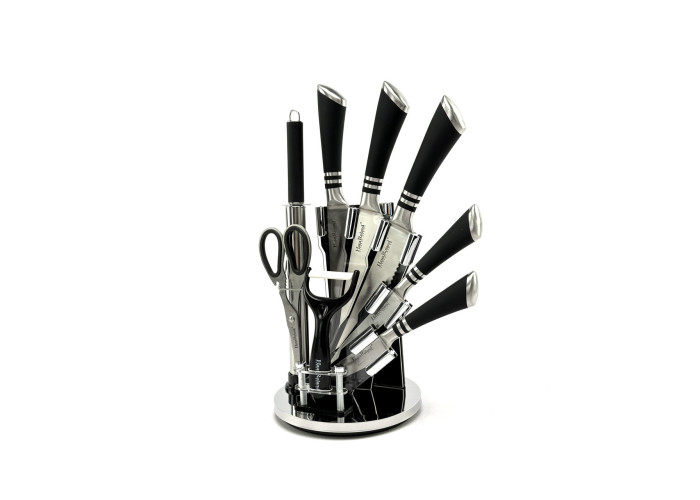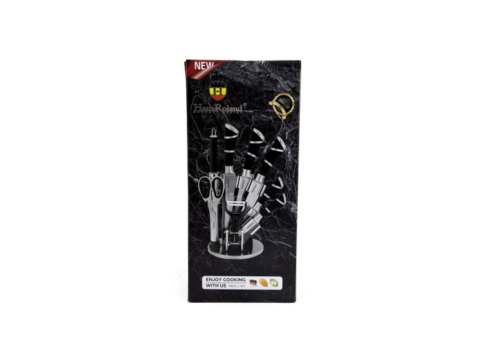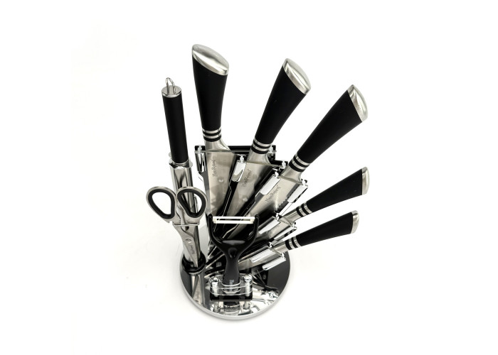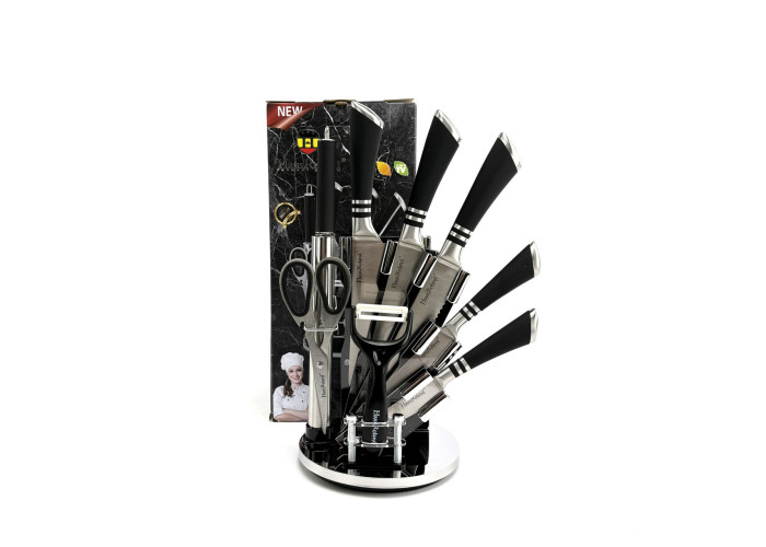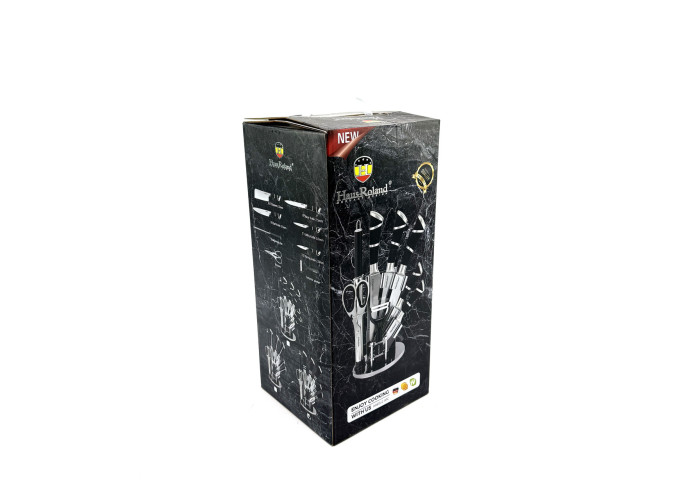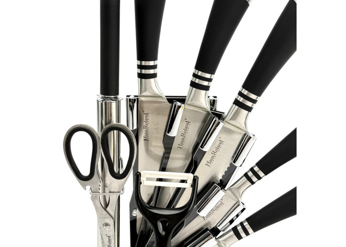 Набор Haus Roland HR615-2 об'єднує в собі професійну продуктивність і ефектний дизайн. Гострі леза зі сталі 3Cr13 гарантують легкість і точність різання, а порожнисті ручки з неіржавкої сталі 430 забезпечують ідеальний баланс і знижують втому руки. Двоколірний дизайн ручок, що поєднує сатинованому сталь і чорне покриття, надає набору строгого та сучасного вигляду. У комплекті ви знайдете 5 ножів, включно з 18-сантиметровим топуванням, а також мусатом, ножицями й овочечисткою з керамічним лезом. Все це розміщується на стильній акриловій підставці, що обертається на 360 градусів для максимальної зручності.