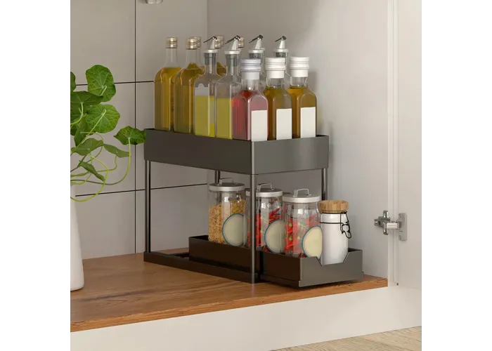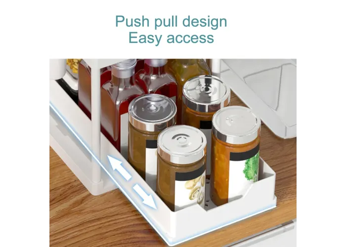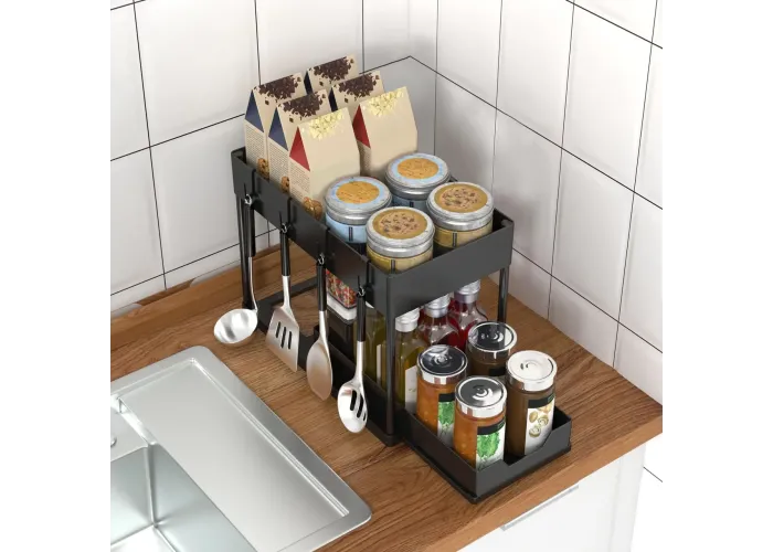 Висувний органайзер під раковиною дворівневих органайзерів під раковиною — ідеальний спосіб збільшити простір для зберігання на кухні або у ванній кімнаті. Він підходить для більшості шаф під раковиною, ефективно використовуючи вертикальний простір для зберігання засобів для чищення.