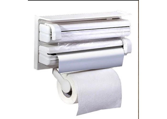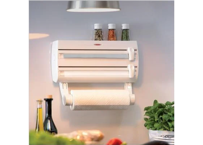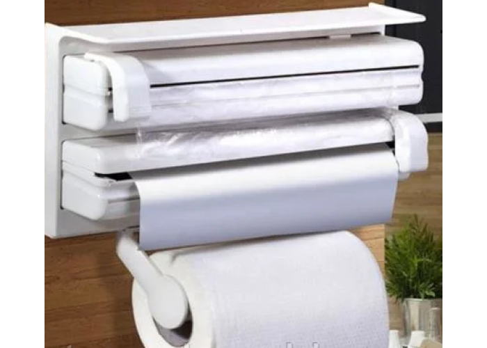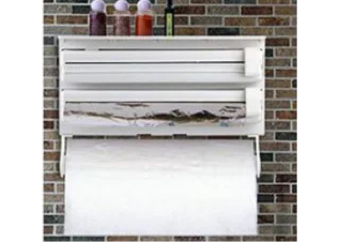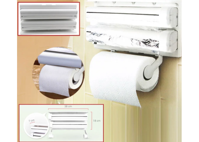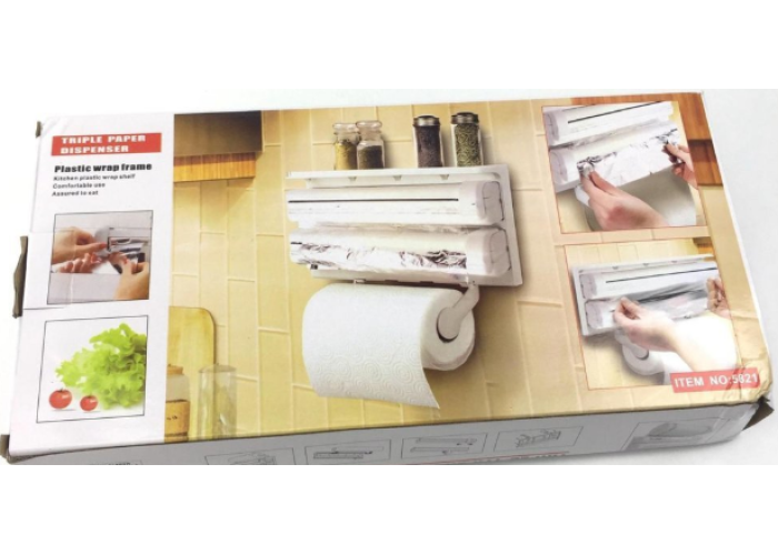 Удобный кухонный диспенсер Kitchen Roll Triple Paper Dispenser изрядно облегчит жизнь хозяйкам! Можно использовать для пищевой пленки, фольги и бумажных полотенец. Теперь пленка и фольга не будет путаться, плохо отрезаться и портить ваши нервы ― в диспенсере встроено лезвие и одним легким движением вы быстро отрежете нужный кусок пленки! А бумажные полотенца не будут падать и намокать, если во время готовки Вам в спешке понадобится парочка полотенец, чтобы вытереть руки.