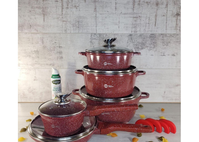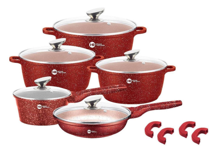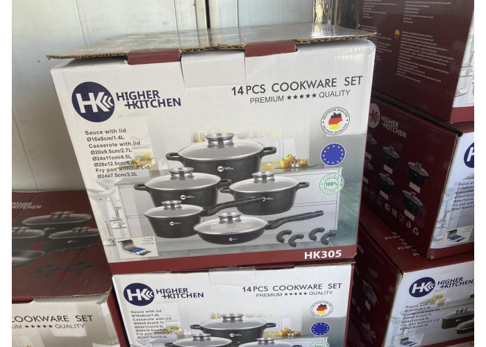Набір кухонного посуду Higher Kitchen - — це посуд з екологічно чистого матеріалу литого алюмінію, що має високу теплопровідність, гігієнічність і довговічність. Дно каструль 5-шарове, термоакумулювальне не деформується, забезпечує рівномірну теплопровідність, швидкий розподіл і тривале утримання тепла, завдяки чому неабияк знижується ризик пригорання їжі.