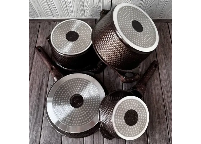 Каструля має внутрішнє та зовнішнє гранітне покриття. Зовні поверхня набору ребриста