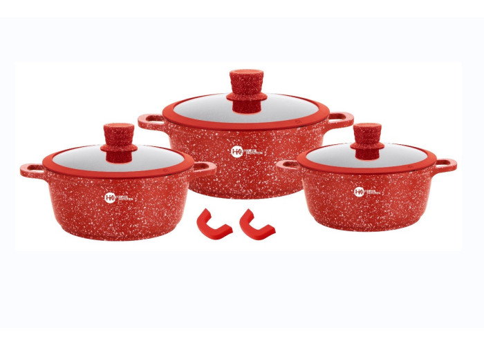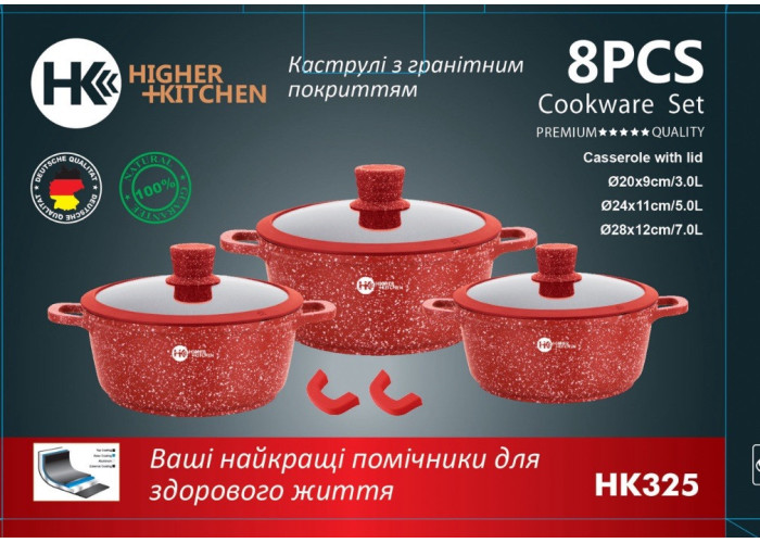 Набір із граніту. Посуд має індукційне дно, що робить його сучасним. До комплекту входить 3 гранітні котла з кришками, а також у комплекті 2 накладки для ручок. 3-шарове антипригарне покриття не впливає на смак і запах їжі та запобігає пригоранню. Цей кухонний набір не містить шкідливих речовин у своєму складі та дає змогу готувати їжу з мінімальною кількістю олії. Ідеально для приготування низькокалорійної, дієтичної їжі. Унікальне індукційне дно TURBO INDUCTION економить 35% енергії, забезпечуючи рівномірний розподіл тепла на всій площі посуду. Набір посуду Higher Kitchen підходить для всіх різновидів плит: газових, електричних, індукційних, галогенних і склокерамічних. Можна мити в посудомийній машині, готувати в духовці.