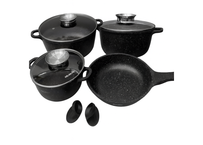 Посуд виготовлений із литого алюмінію з міцним гранітним антипригарним покриттям, що гарантує рівномірне нагрівання, легкість у догляді та довговічність. Сучасний дизайн, поєднання чорного або червоного кольору й елегантних ліній надають набору преміального вигляду.