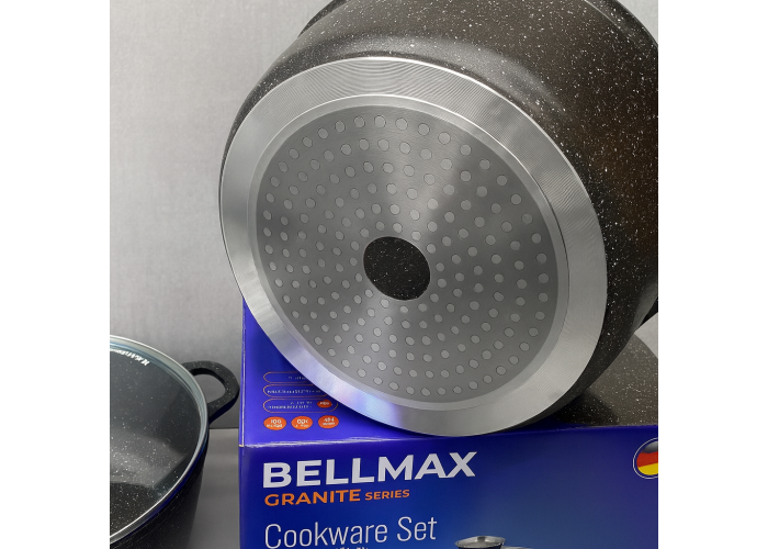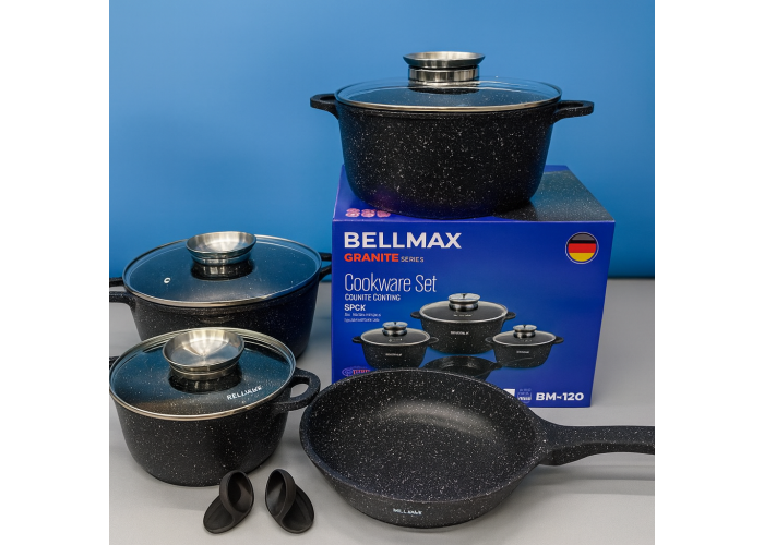 Відкрийте для себе ідеальний набір посуду Bellmax Cookware Set BM-120 — втілення стилю, функціональності та надійності. Цей комплект із 9 предметів забезпечить усе необхідне для комфортного приготування страв на будь-якій кухні.