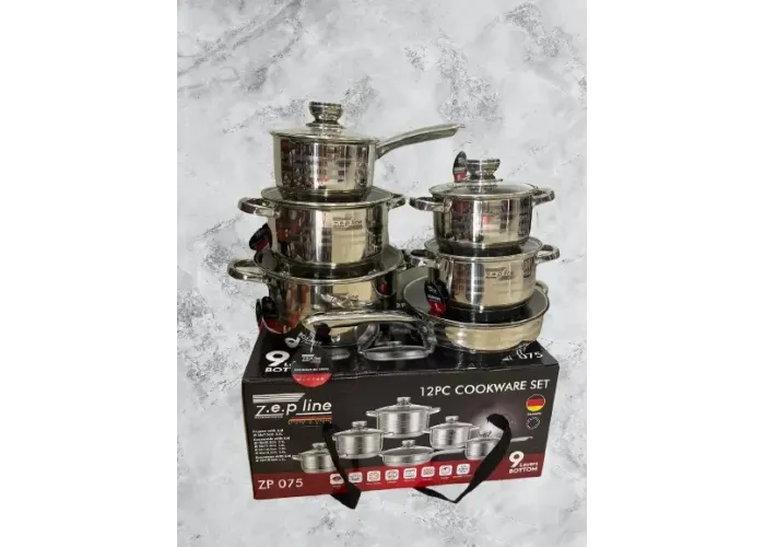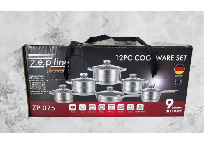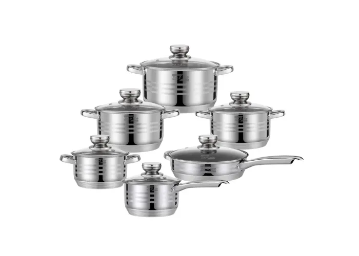 Набір посуду складається з 12 предметів: 4 каструлі різного об'єму з кришками, 1 ковша й 1 сковороди з антипригарним покриттям.
