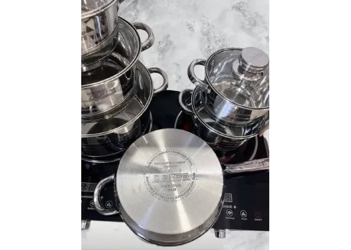 Також дуже легко чиститься й залишки їжі та жиру не збираються в кутах. Неіржавка високоякісна харчова сталь. Ефект швидкого нагрівання та рівномірного розподілу тепла, що запобігає пригоранню в процесі приготування. Цей набір буде гарним придбанням для сім'ї або прекрасним подарунком на весілля або ювілей, день народження, іменини, можна сказати в будь-яке свято.