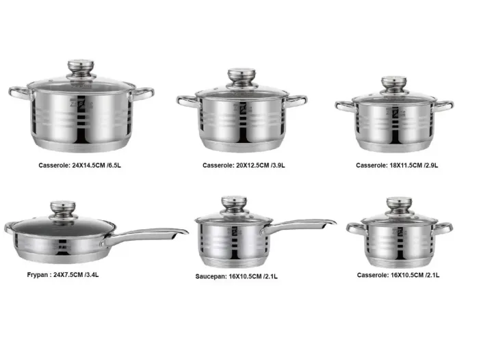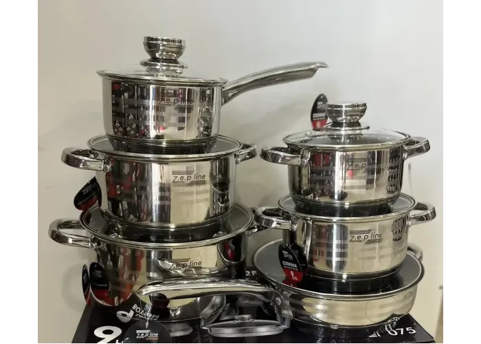 Ручки за час приготування майже не гріються, прикріплені на заклепках. Предмети кухонного набору посуду схрещені скляними термостійкими кришками. Сковорода зі стійким до пошкодження покриттям. Набір посуду для приготування має 9-шарове капсульне дно, що дає змогу готувати Ваші улюблені страви без особливих зусиль, зберігаючи їхню корисність і соковитість.