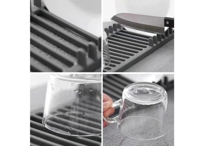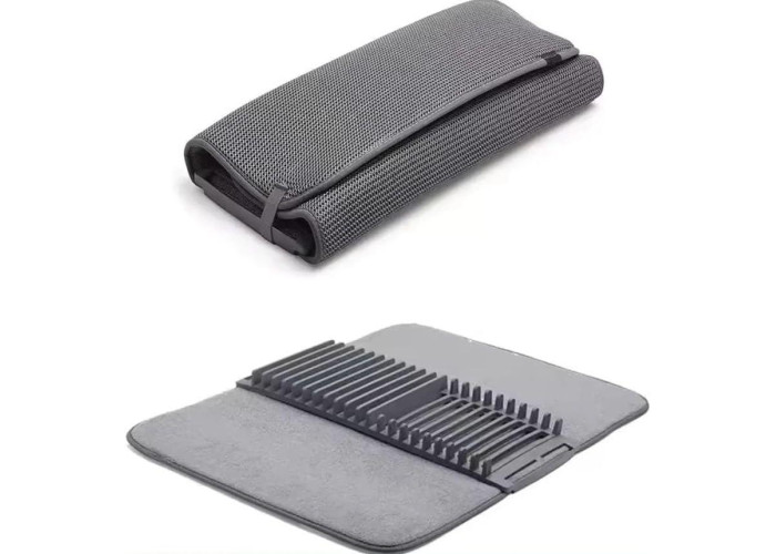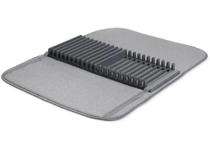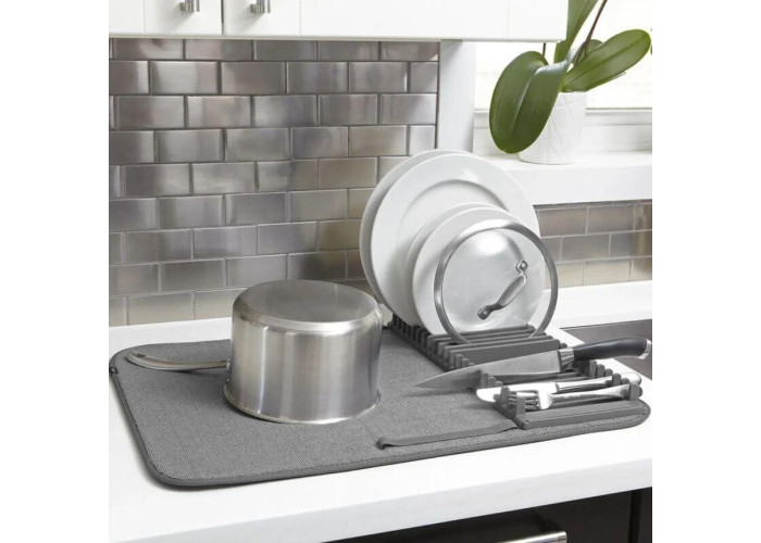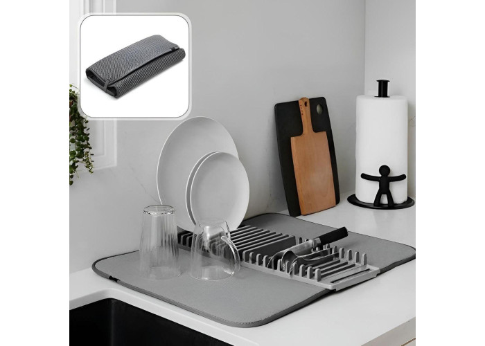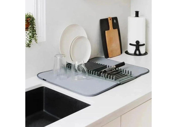Виготовлена з якісного пластику та мікрофібри. Сушарка підходить для різних типів посуду, включно з тарілки, склянками та столовим приладдям. Конструкція передбачає наявність спеціалізованих відсіків для різних предметів, що забезпечує надійність і зручність у використанні. Килимок, що входить до комплекту, захистить стільницю від зайвої вологи та забезпечить додаткову стійкість.