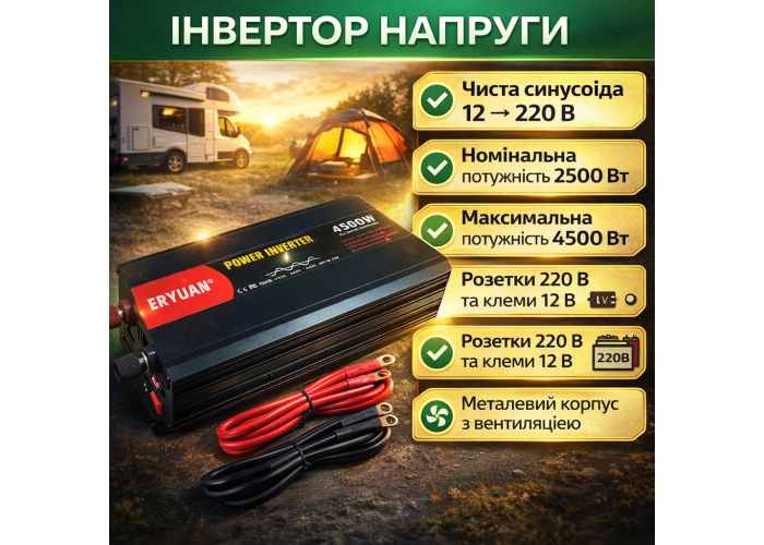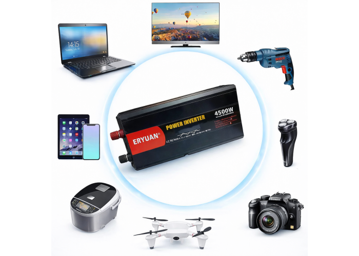Його потужність 4500 Вт дає змогу під'єднувати широкий спектр приладів. Інвертор обладнаний захистом від перевантаження, короткого замикання й перегрівання, що гарантує безпеку експлуатації. Міцний корпус і система активного охолодження забезпечують надійну роботу навіть у разі інтенсивних навантажень. Компактні розміри та зручні клеми під'єднання спрощують встановлення та транспортування.