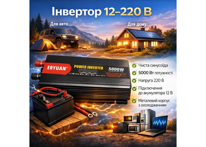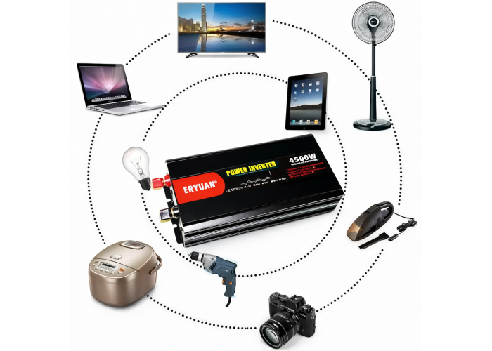 Автомобільний інвертор ERYUAN призначений для перетворення постійної напруги 12 В, що надходить від автомобільного або стаціонарного акумулятора, у змінну напругу 220 В з чистою синусоїдою.