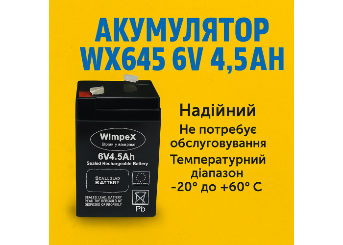 Акумулятор WX 645 з напругою 6 В і ємністю 4.5 А·год — це герметичний олив'яно-кислотний акумулятор (VRLA), призначений для стабільного живлення різного обладнання. Не вимагає обслуговування, безпечний в експлуатації та підходить для тривалої роботи в буферному та циклічному режимах.