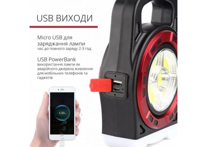 USB-шнур дає змогу використовувати зарядний пристрій як для телефона від мережі 5 В/220 В через блок (не комплектується) або отримувати живлення від Power Bank, ноутбука або вдень від сонячної панелі розміром 40х55 мм. Треба враховувати, що сонячна панель таких розмірів зможе тільки заряджати ліхтар. Для повного заряджання необхідно скористатися зарядкою від мережі.