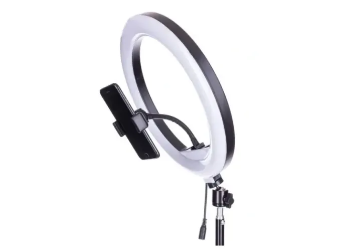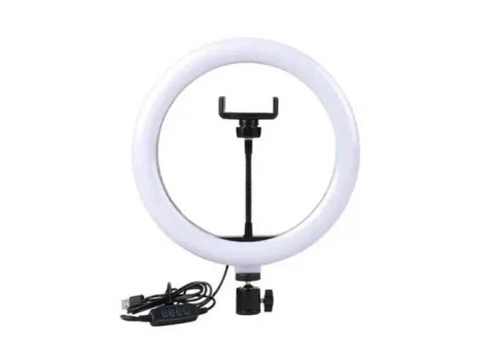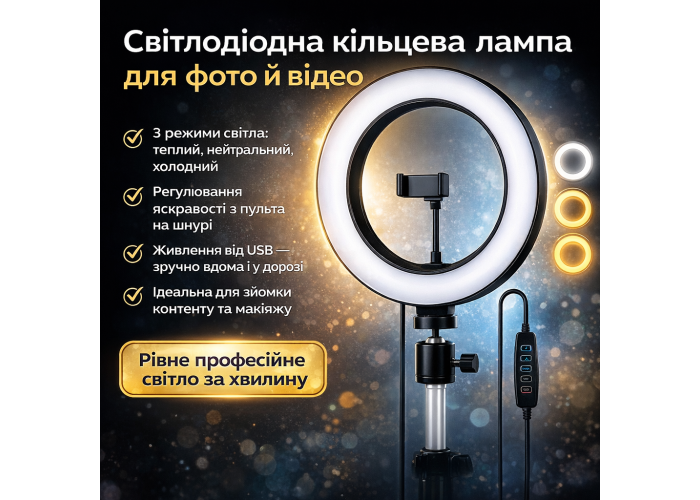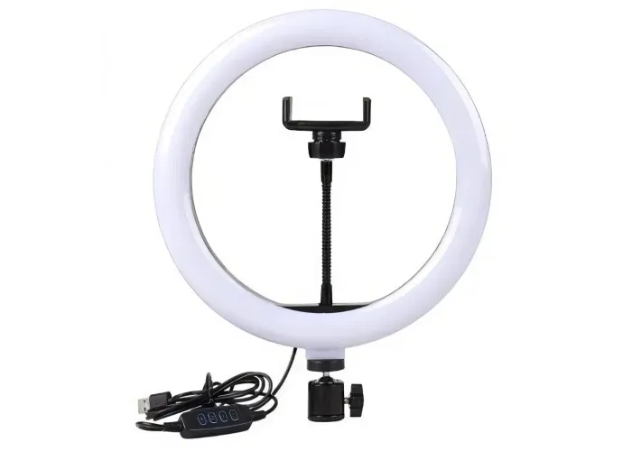 Лампа під'єднується через USB — її можна живити від мережевого адаптера, ноутбука, комп'ютера або павербанка. На дроті розташований пульт керування, за допомогою якого регулюються яскравість і колірна температура: від теплого до холодного відтінку, підлаштовуючись під різні сценарії знімання та час доби. Вбудований тримач для телефона дає змогу зафіксувати смартфон у центрі кола, забезпечуючи рівне освітлення обличчя або предмета.
