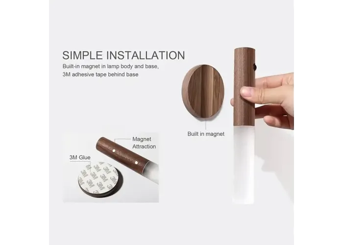 Пристрій дуже простий у використанні. Сама лампа заряджається від USB. Щоб розмістити основу світильника в зручному для Вас місці, досить зняти захисний шар із задньої частини та приклеїти основу на стіну, полицю або будь-яке інше місце. Лампа кріпиться на основу за допомогою магніту.