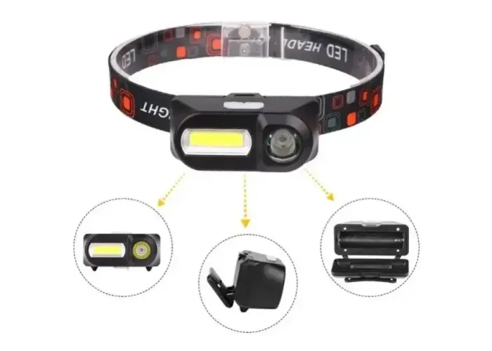 Ліхтар обладнаний сенсором руху. Виготовлений із легкого та міцного пластикового корпусу. Має регульоване кріплення на голову.