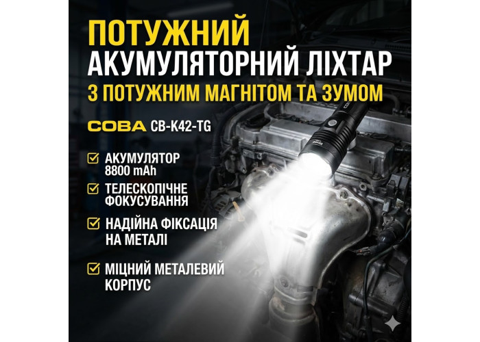 Потужний універсальний ліхтарик COBA CB-K42-TG TG2000M — це надійне джерело світла для дому, автомобіля, риболовлі, роботи та активного відпочинку. Обладнаний яскравим світлодіодом, функцією зуму, вбудованим акумулятором великої ємності та магнітом для кріплення — він стане незамінним помічником у будь-якій ситуації.