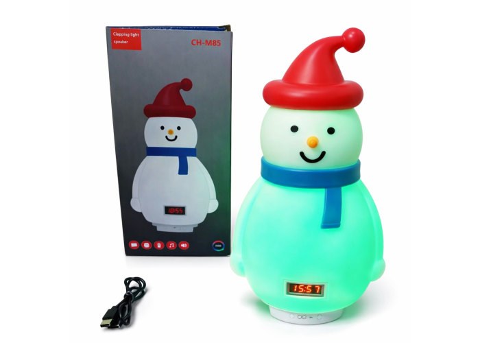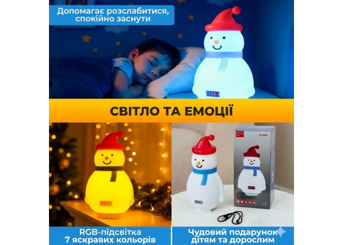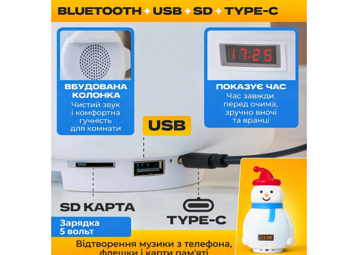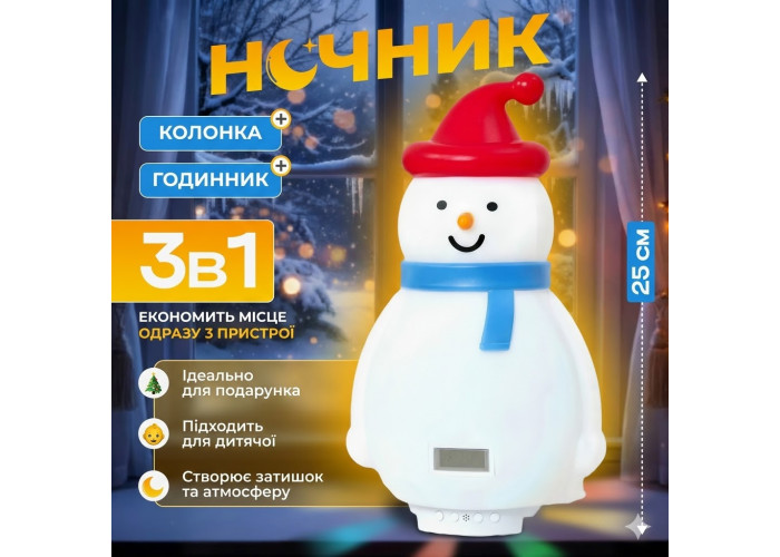 Дитячий акумуляторний нічник-Сніговик — це сучасний багатофункціональний світильник, який об'єднує м'яке нічне освітлення, кольорову RGB-підсвітку, вбудовану Bluetooth-колонку та функцію електронних годинників.